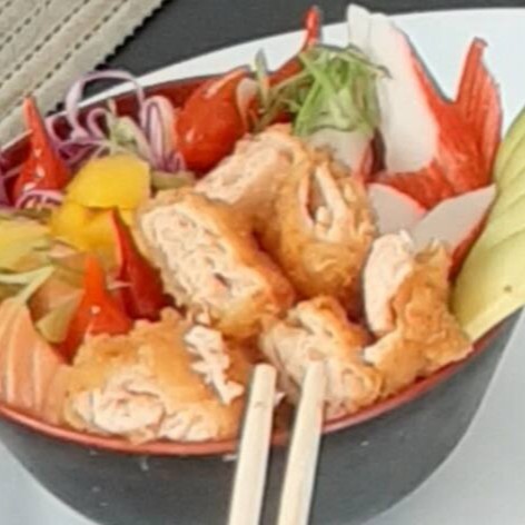 Salmão, camarão, kani frito, manga, repolho roxo, pepino desidratado e gergelim