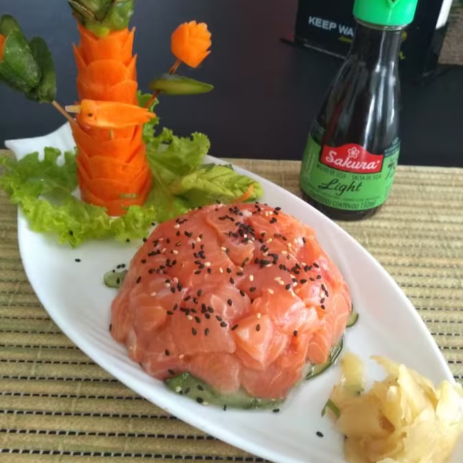 Salmão, manga, cenoura, repolho roxo, pepino desidratado e gergelim