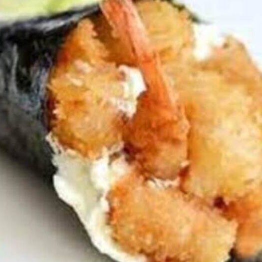 Camarão crocante empanado e frito com crem cheeses e cebolinha.