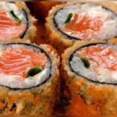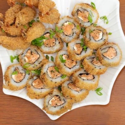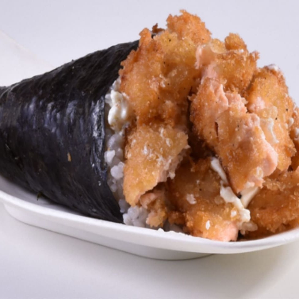 Uma camada fina de arroz com uma suculenta pasta de salmão com cream cheese, empanado no panko e frito.