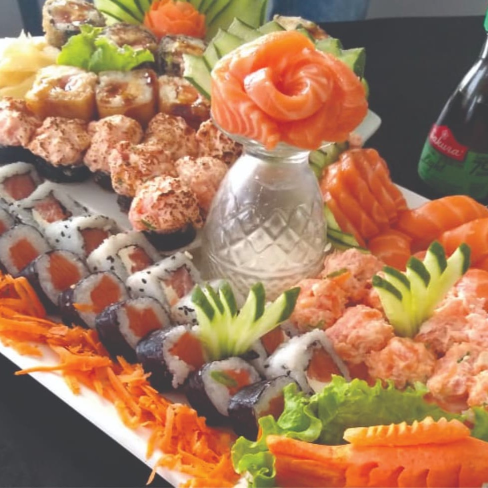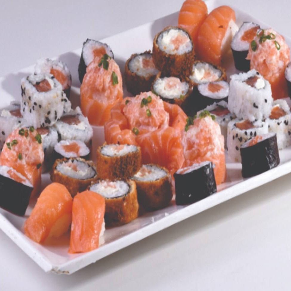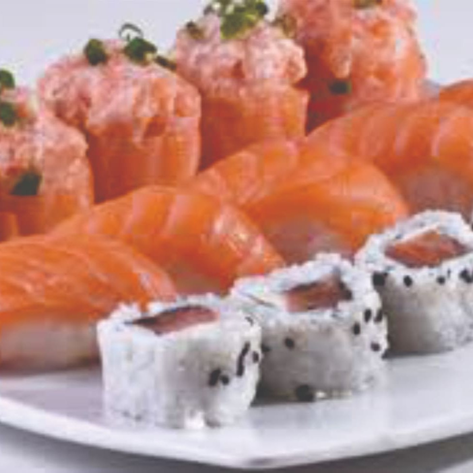 05 sashimi, 05 joy joy bem suculentos, 10 deliciosos niguiri, 10 ura filadelfia, 10 rossomaki, 10 cariocas, natural ou maçaricados ( caso o cliente não escolha, enviaremos natural).