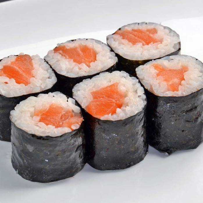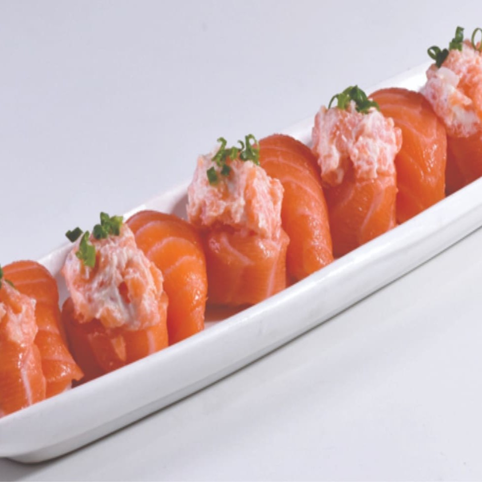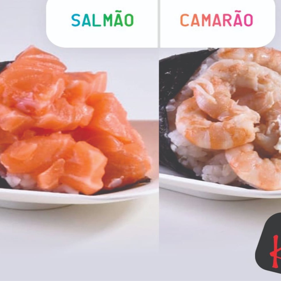Salmão natural, salmão maçaricado, salmão crocante, camarão, kani ou atum, com uma pequena quantidade de arroz.