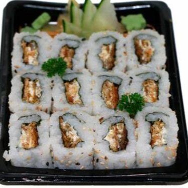 Uma camada fina de arroz com gergelim, e cubos suculentos kani empanado e frito, com uma generosa porção de cream cheese