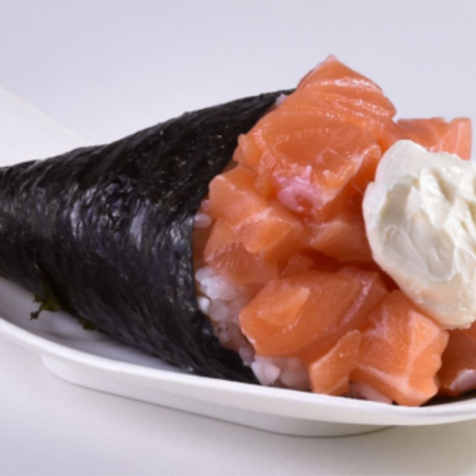 01 temaki carioca e 10 ura carioca, uma camada fina de arroz com uma suculenta pasta de salmão, e uma generosa porção de cream cheese, empanado e frito.