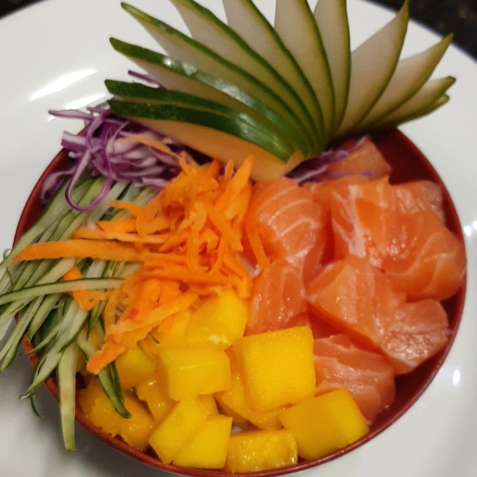 Uma camada de arroz, salmão, camarão, atum ou peixe branco, Manga Pepino, cenoura, repolho roxo, cream cheese (escolha como vc gosta)