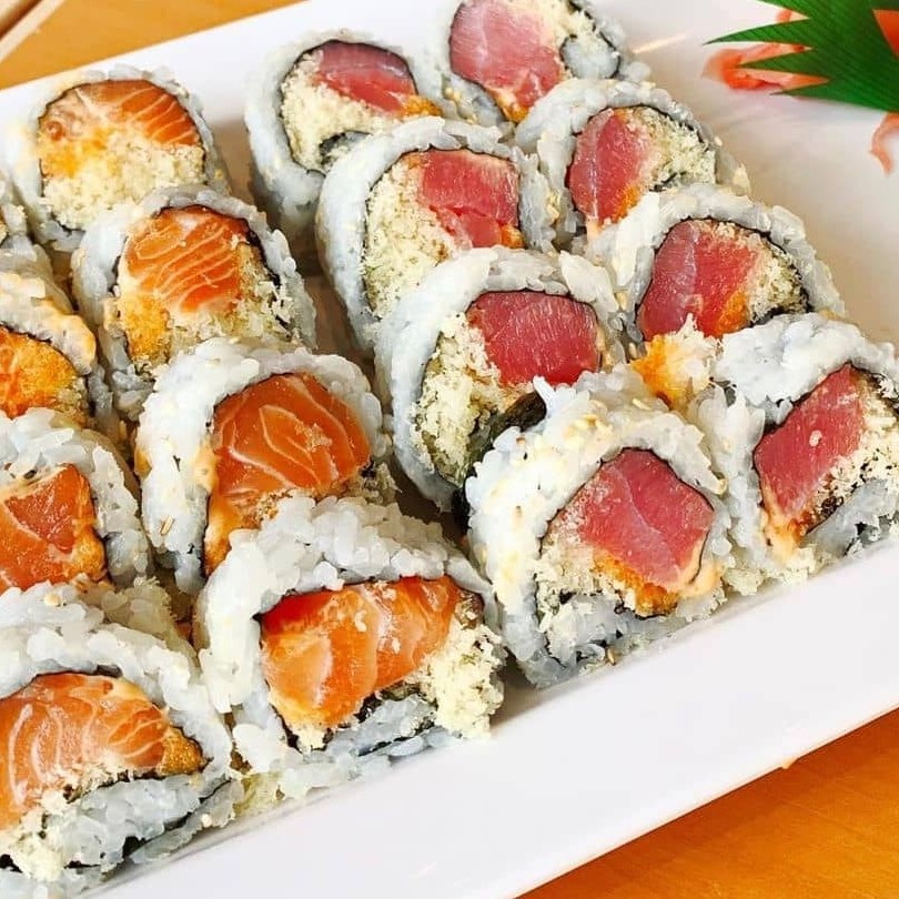 01 com uma camada fina de arroz, e cubos suculentos de salmão e uma generosa porção de cream cheese e o outro com recheio de camarão ( o cliente pode solicitar a troca dos recheios).