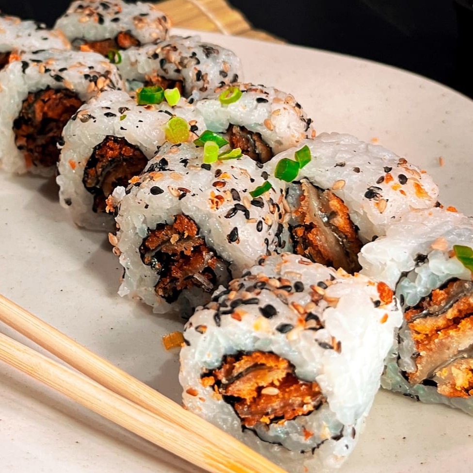 Arroz enrolado no nori com recheio de kani e cream cheese.