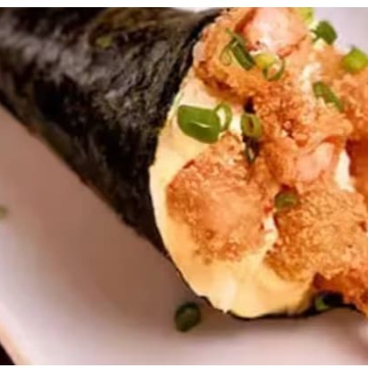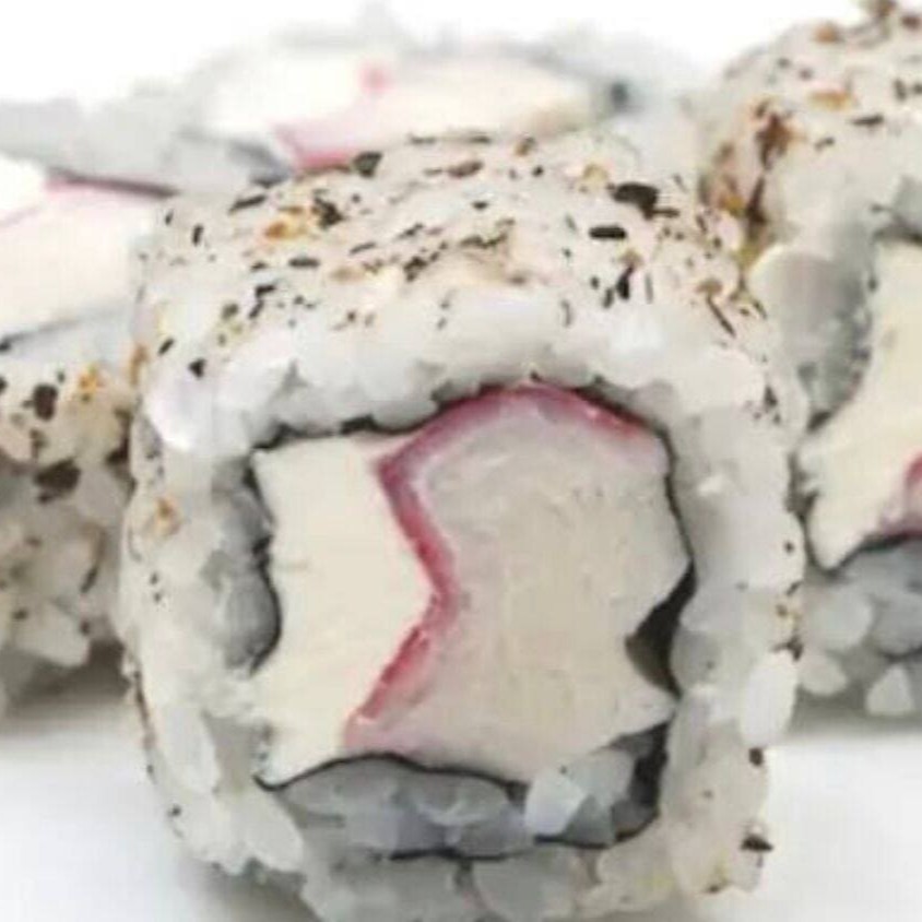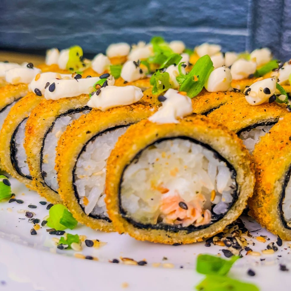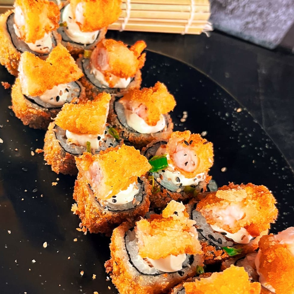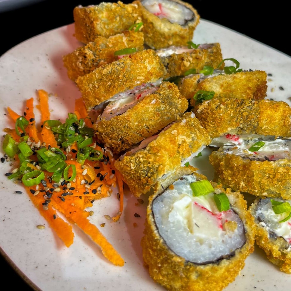 Arroz enrolado na massa empanada e crocante, com recheio de kani e cream cheese.