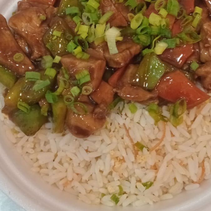 Contém frango + arroz branco