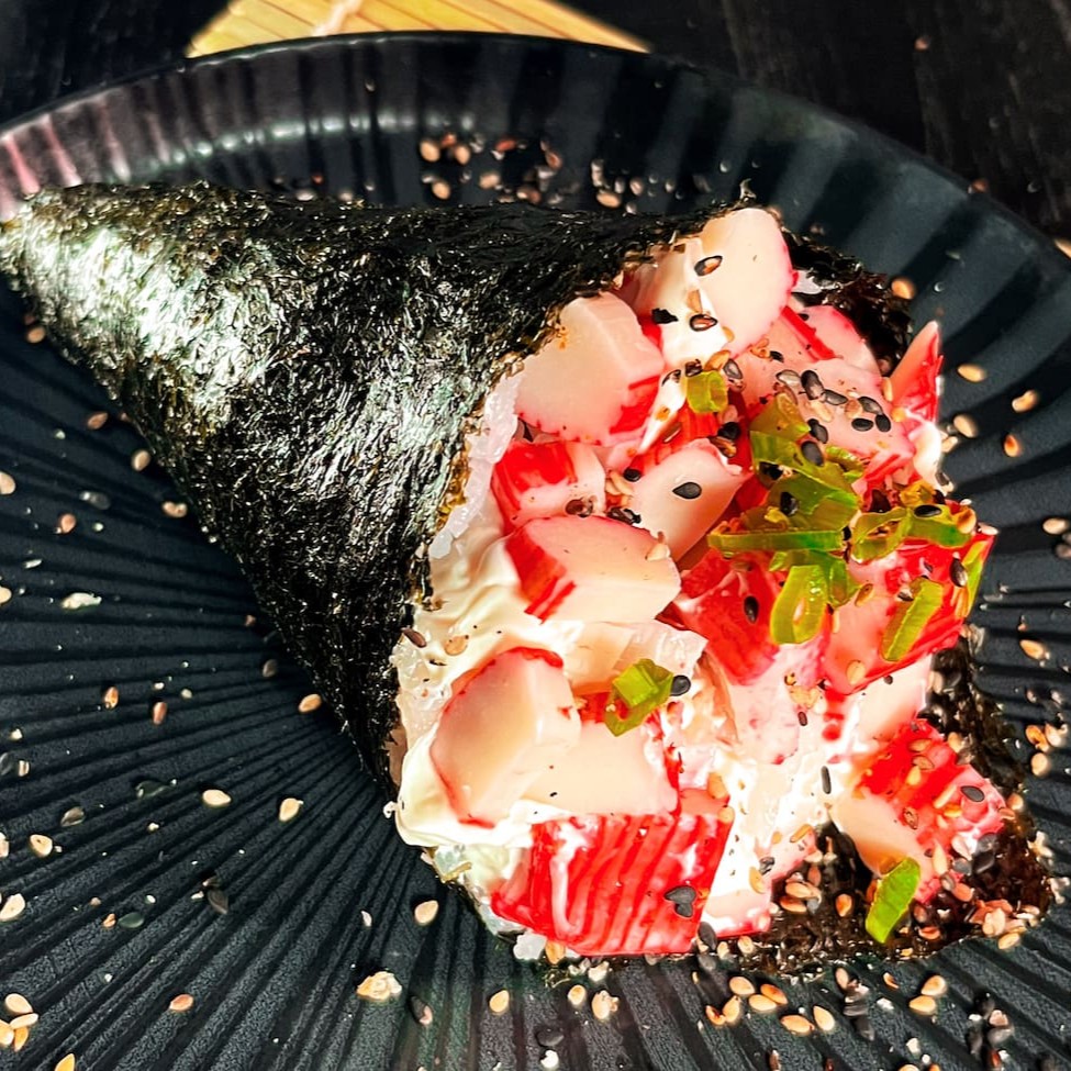 Temaki na alga recheado com arroz, kani, cream cheese e cebolinho.