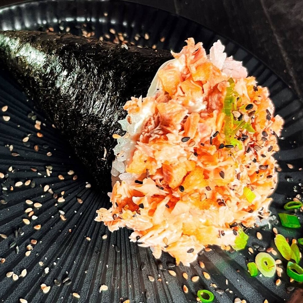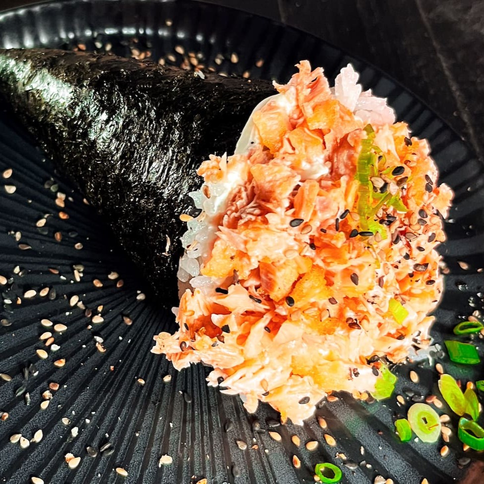 Temaki na alga recheado com arroz, pasta de salmão, cream cheese e cebolinho.