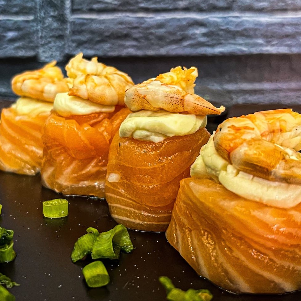 Bola de arroz enrolada com lâmina de salmão, recheado com camarão cozido e cream cheese por cima.