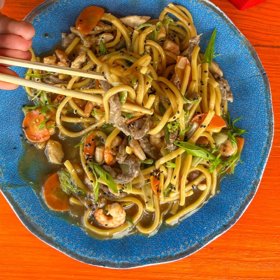 Nosso delicioso bifum com frango, carne, camarões e legumes salteados no molho oriental. Leve, saboroso e irresistível!
