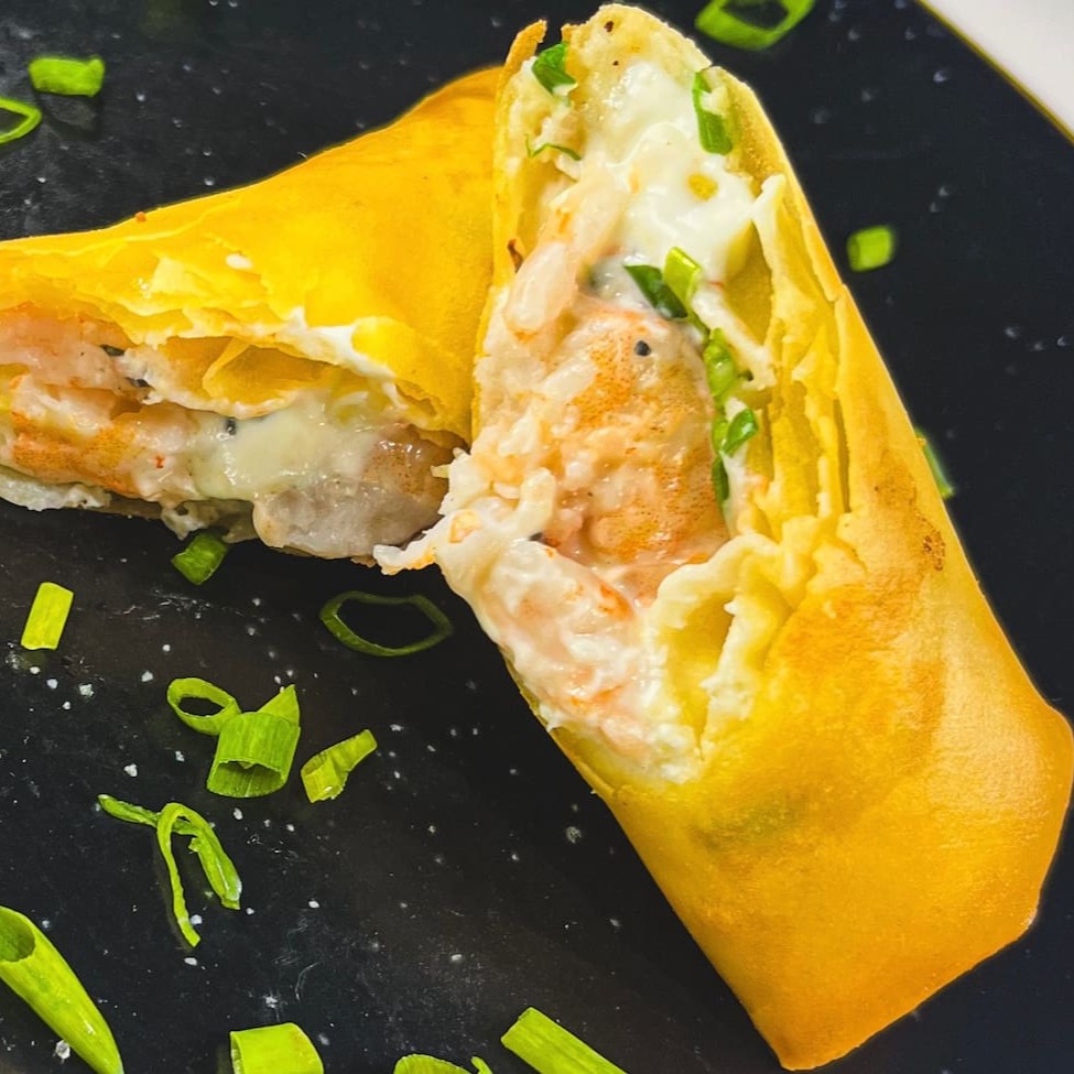 Massa de harumaki com recheio de camarão cozido, cream cheese e cebolinho.
