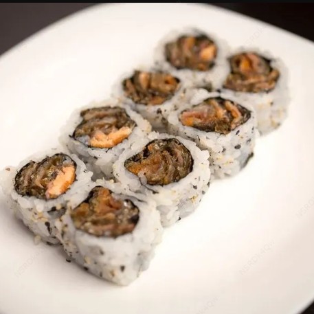 arroz enrolado no nori com recheio de pele de salmão crocante e cream cheese.
