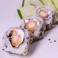arroz enrolado no nori com recheio de camarão empanado e cream cheese.