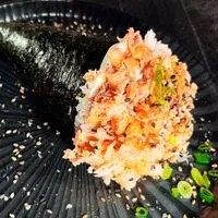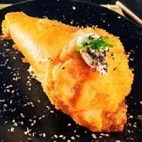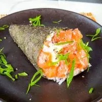 temaki na alga todo empanado, recheado com arroz, pasta de salmão, cream cheese e cebolinho.