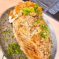 manta de salmão recheada com arroz, camarão empanado, skin, cream cheese e cebolinho.
