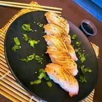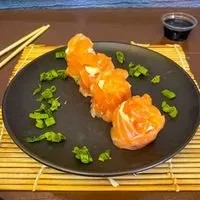 4 joy de couve frito, 4 niguiri de salmão, 4 niguiri de atum, 4 niguiri de camarão, 6 uramaki de salmão, 2 ebi ball.