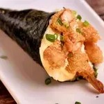 temaki na alga recheado com arroz, salmão, camarão empanado, cream cheese e cebolinho.
