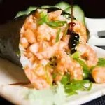 camarão crocante enrolado na lâmina de salmão e cream cheese.