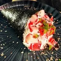 temaki na alga recheado com arroz, kani, cream cheese e cebolinho.