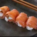 arroz enrolado no nori com recheio de salmão e cream cheese.