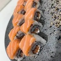 uramaki de salmão finalizado com lâmina de salmão por cima.