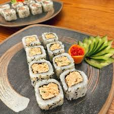 Arroz enrolado na massa empanada e crocante, com recheio de pasta salmão e cream cheese.
