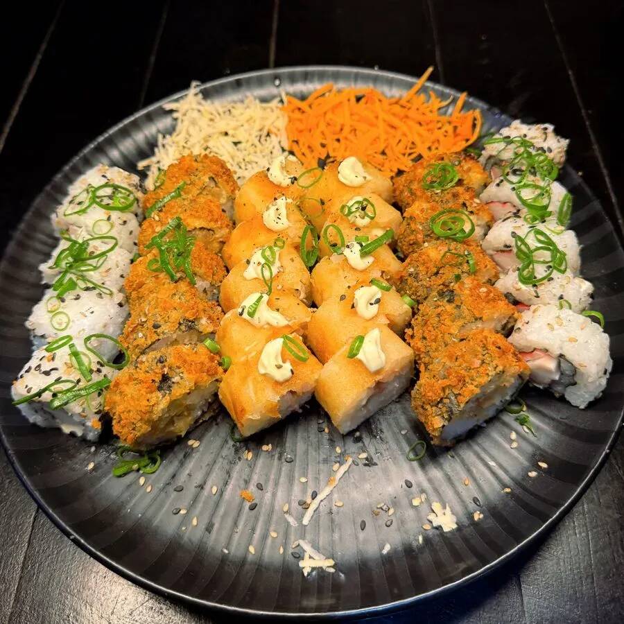 Massa de harumaki recheada de salmão, kani, camarão empanado e cream cheese.