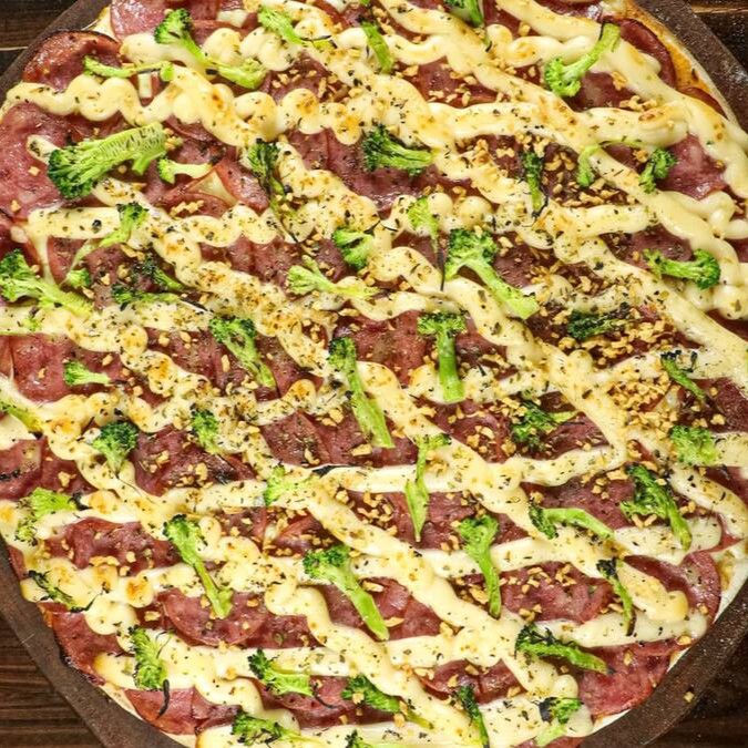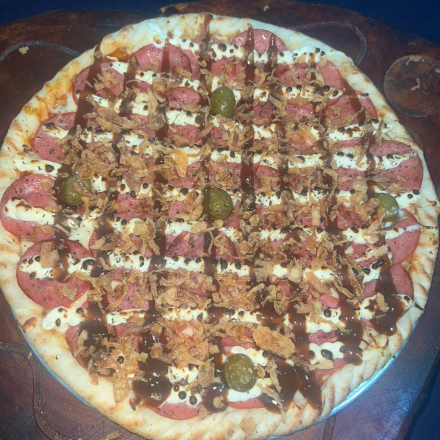 molho de tomate mussarela calabresa creme cheese barbecue cebola crocante e oregano