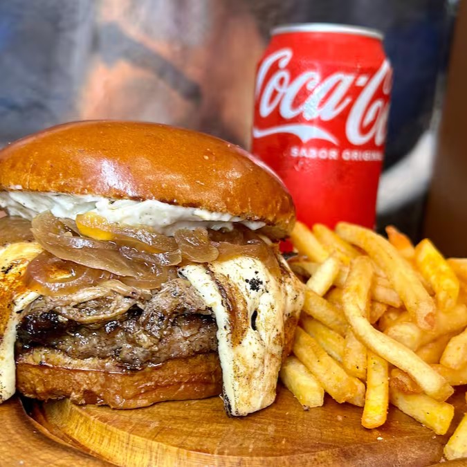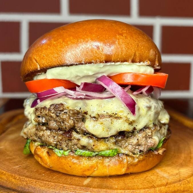 Pão brioche selado na chapa, 2x blend angus de 160g com queijo mussarela maçaricado, cebola e tomate chapeados, e deliciosa maionese da casa.