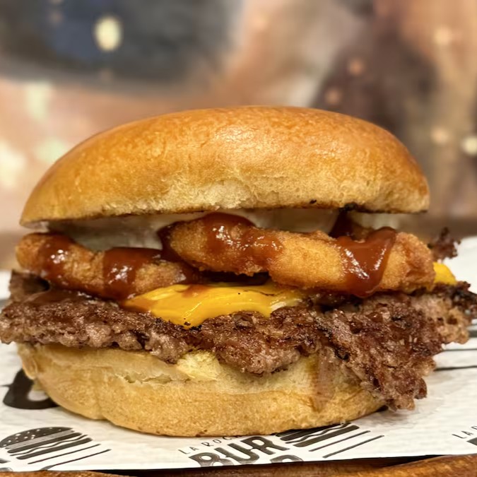 Pão Brioche, Smash de 90g, queijo cheddar, onions rings extremamente gostoso, maionese e barbecue.