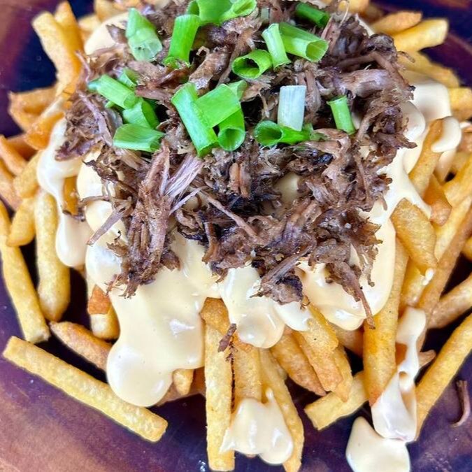 Batata fininha e crocante com delicioso molho de creme de queijo e cupim desfiado delicioso e cebolinhaa