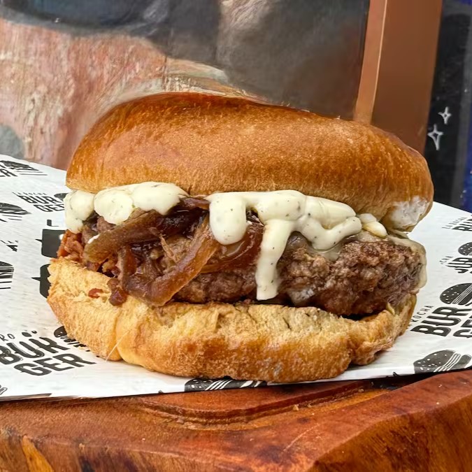 Pão brioche selado na chapa, blend de 160g acompanhado de molho gorgonzola cremoso maçaricado e cebola caramelizada.