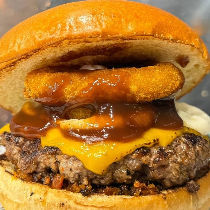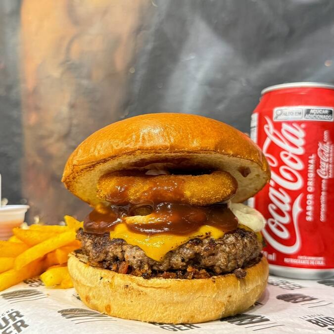 Pão brioche, blend de 160g, queijo cheddar, deliciosa maionese da casa, farofa de bacon, onions rings e finalizado com toque de barbecue