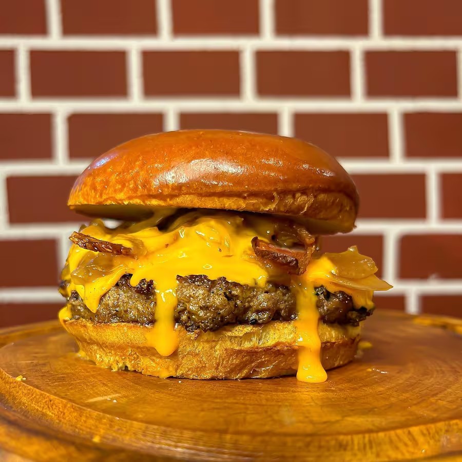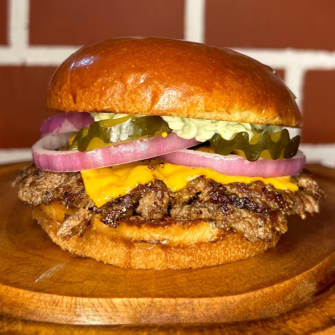 Pão brioche selado na chapa, 2x smash burger de 90g crocantes com queijo cheddar derretido, cebola roxa chapeada, picles e deliciosa maionese da casa.