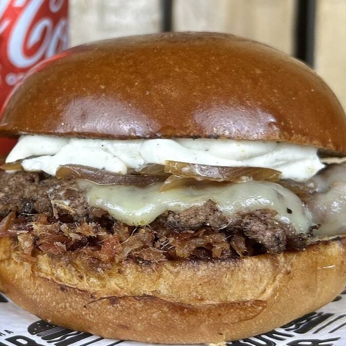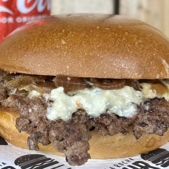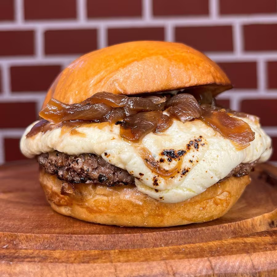 Pão brioche selado na chapa, Smash Angus de 90g acompanhado de molho gorgonzola cremoso maçaricado e cebola caramelizada.