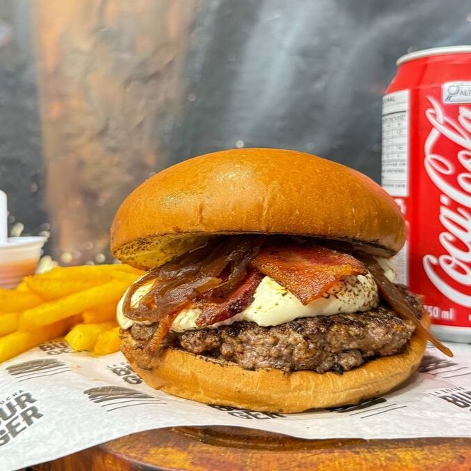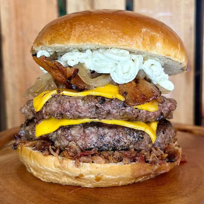 Delicioso hambúrguer artesanal montado da seguinte forma: Pão brioche selado na chapa, 2x blend angus de 160g com queijo cheddar maçaricado, cebola caramelizada, bacon fatia, farofa de bacon e deliciosa maionese da casa.