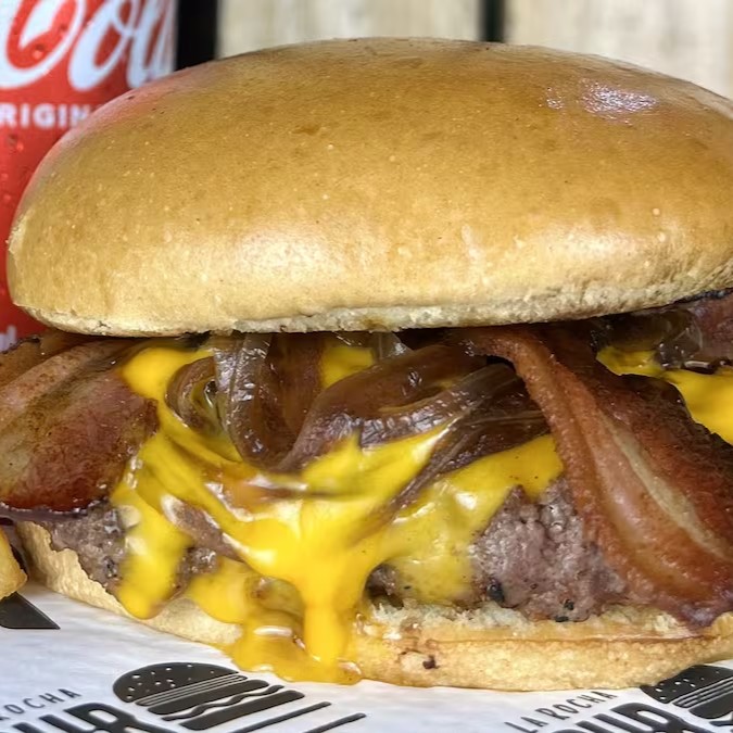 Rocha bacon: Pão brioche selado na chapa, blend angus de 160g com queijo mussarela maçaricado, cebola caramelizada, farofa de bacon crocante e deliciosa maionese da casa.