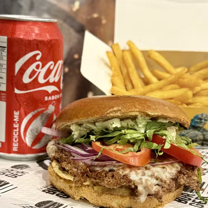 Nosso Smash salada, tomate, cebola e alface, com a nossa deliciosa maionese verde no nosso pão brioche, acompanha batata e Refrigerante Lata de sua preferênciaaa.