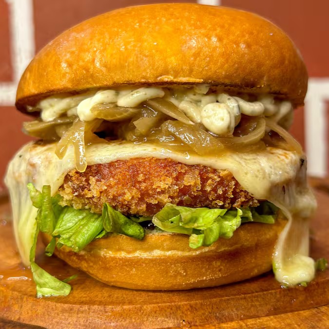 Pão brioche selado na chapa, 100g de blend de frango empanado com queijo mussarela maçaricado, cebola caramelizada no choyo, alface e deliciosa maionese da casa.
