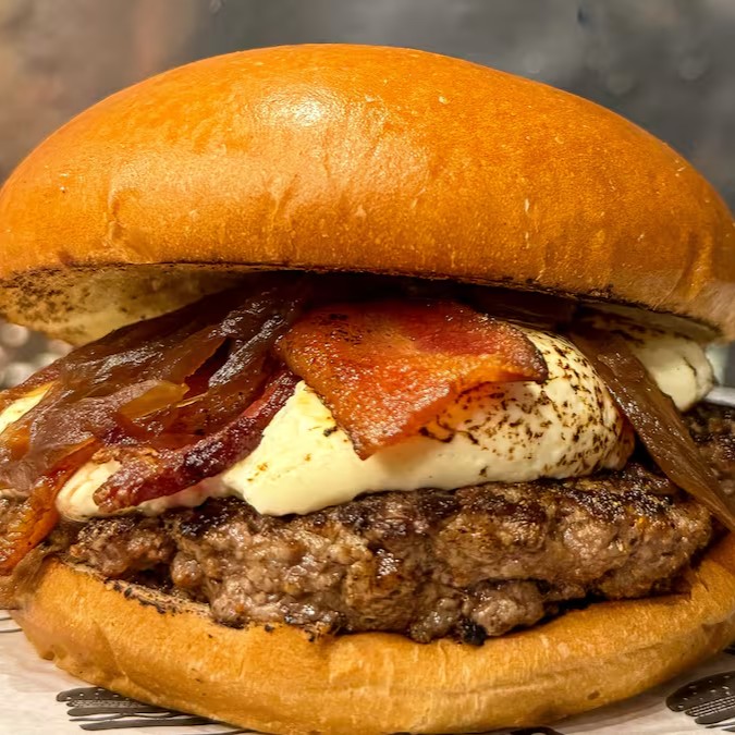 Pão brioche selado na chapa, blend angus de 160g com queijo mussarela maçaricado, cebola caramelizada no shoyo, farofa de bacon crocante e deliciosa maionese da casa.