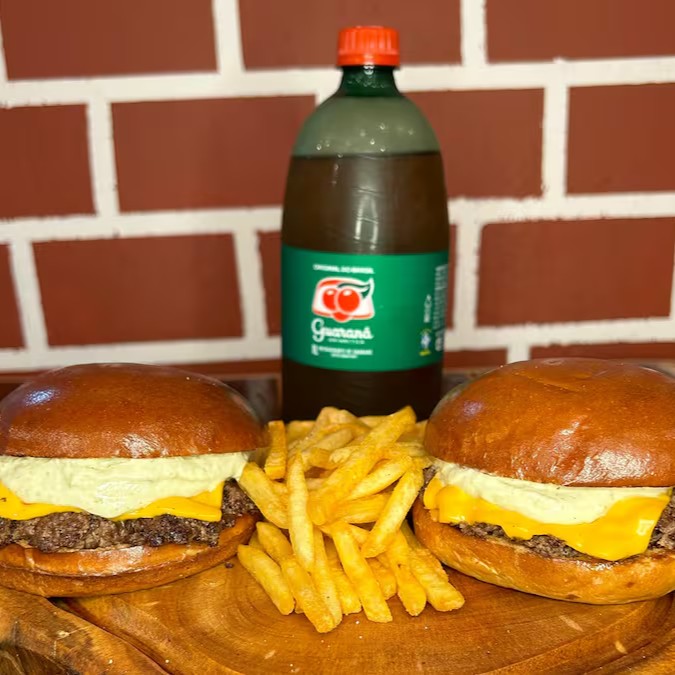 Esse combo acompanha: 2 hambúrgueres (Rochinhas Burger) + 1 Batata-frita + 1 Refrigerante (Litro)
