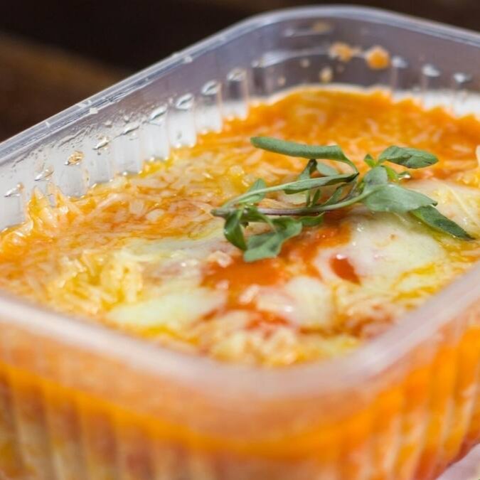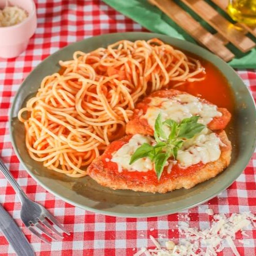 Spaguetti com delicioso frango à milanesa, servido com molho pomodoro e finalizado com queijo mozzarella.