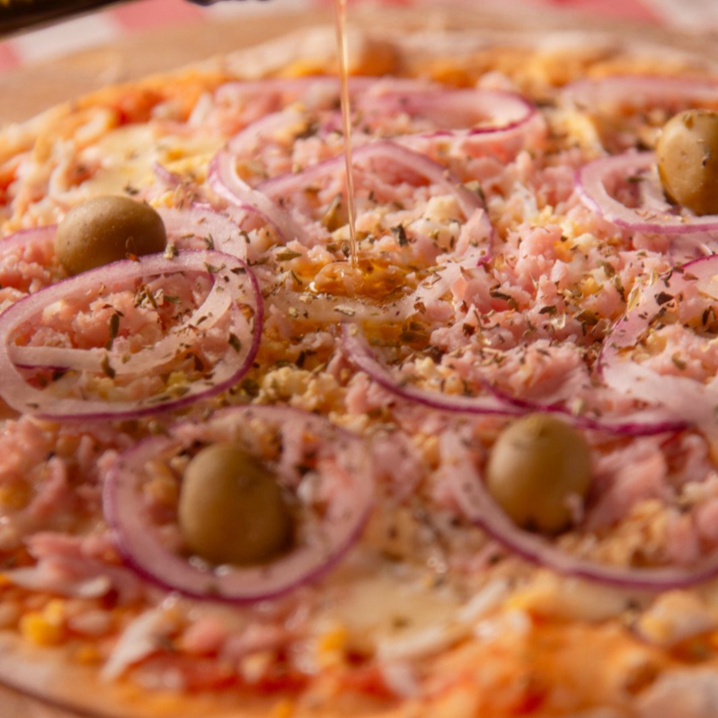 Massa Artesanal , Molho Pomodoro , Queijo Muçarela , Bacon em cubos e Oregano