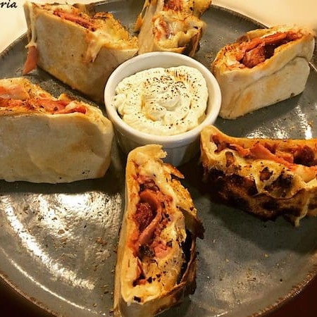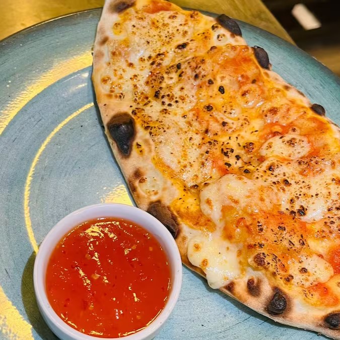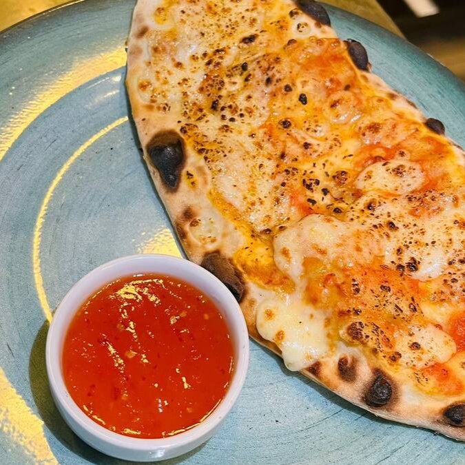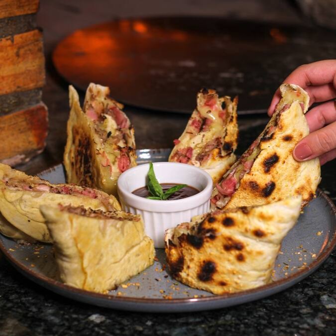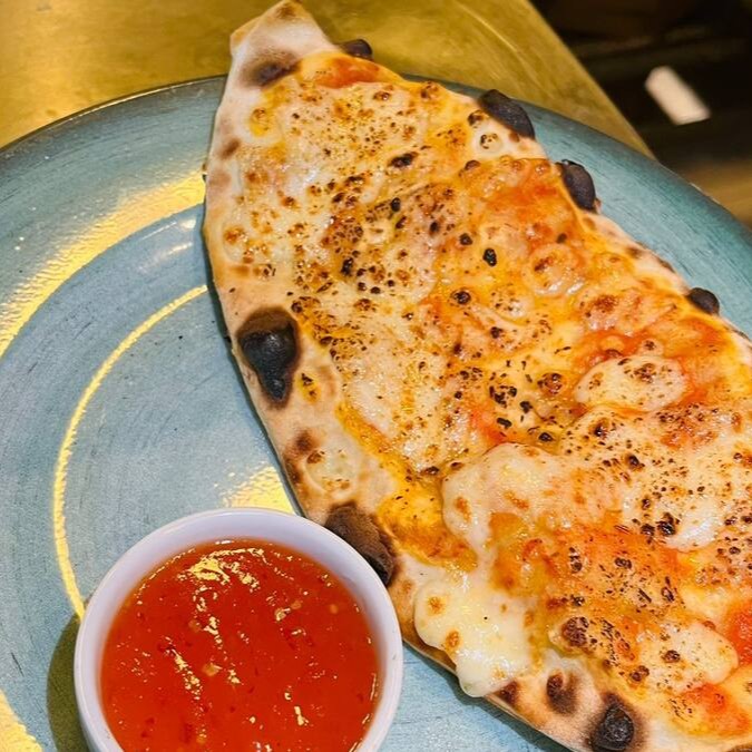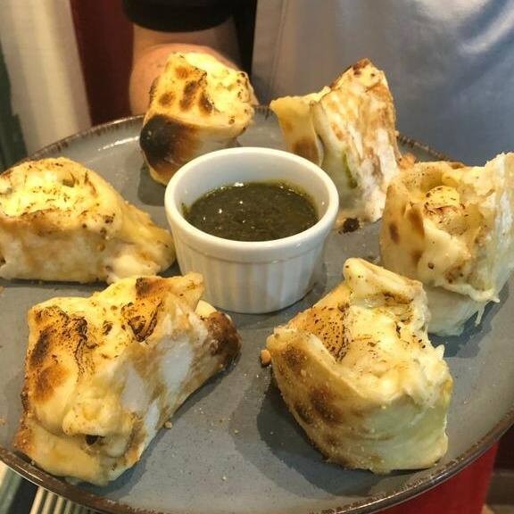 Nosso Stromboli quatro queijos! Recheado com queijo mussarela, provolone, parmesão, gorgonzola, Catupiry Original. Acompanha molho pesto da casa. Só pede!!