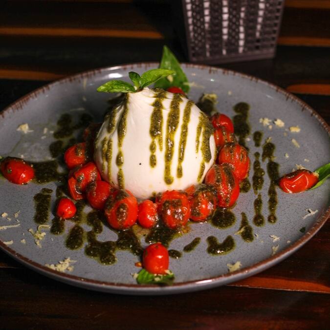 Burrata com molho pesto da casa e tomatinhos cereja confitados, acompanhados por porção de Pizza Branca! Perfeito para um relax com um vinhozinho!