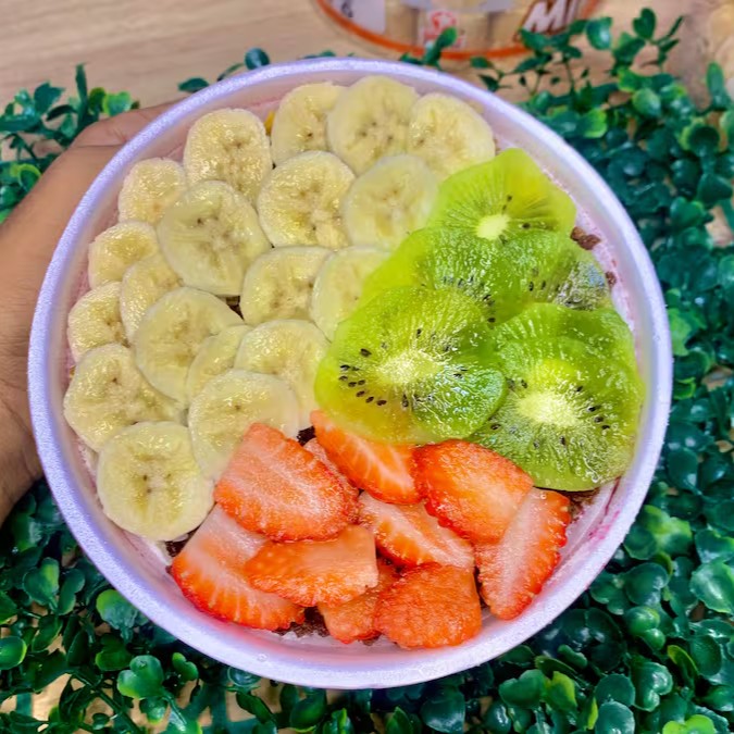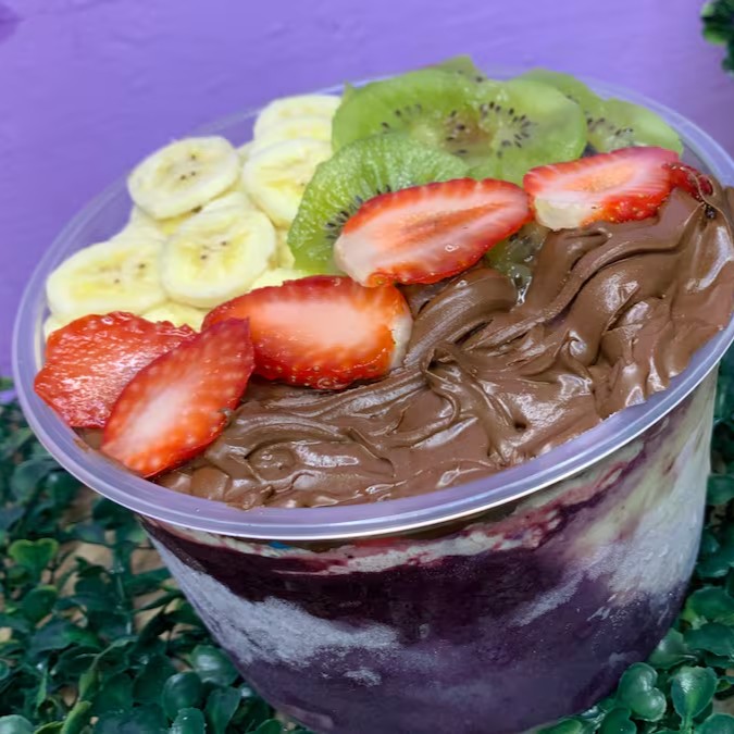 "Açaí cremoso aproximadamente 400ml com 4 acompanhamentos à escolha + 2 frutas frescas + 2 calda a sua escolha para adoçar ainda mas seu delicioso açaí