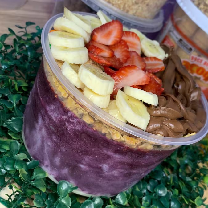"Açaí cremoso aproximadamente 720 gramas com 5 acompanhamentos à escolha + 2 frutas frescas da estação + 2 deliciosas caldas para deixa ainda mas perfeito